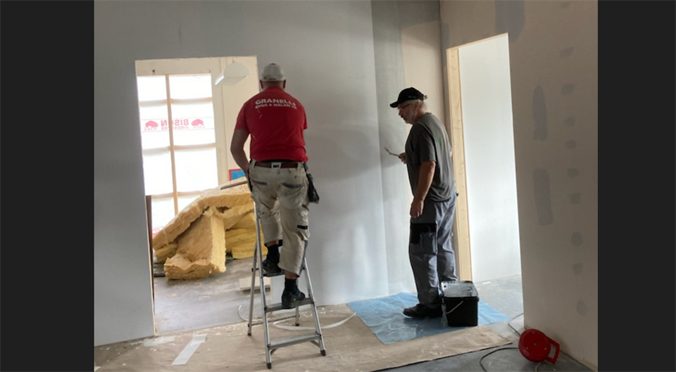 Nu är det dags igen! Vi står inför en viktig arbetsdag nu på lördag. Arbetet med nya omklädningsrummen fortsätter, dessutom har vi mycket annat i hallen som behöver åtgärdas. Det finns arbete för alla, man behöver inte vara snickare eller hantverkare. Dessutom har vi kuuul! Ta chansen att arbeta ideellt för en god sak och samtidigt träffa nya och kanske även gamla kompisar! Välkommen! Bilden: Ett proffs (Niklas Granell) tapetserar och en amatör (undertecknad) lägger klister på väggarna vid en oannonserad arbetsdag.